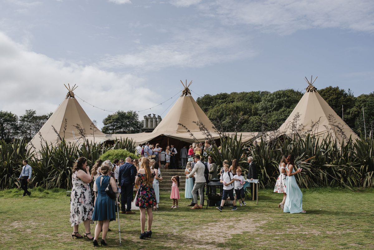 A marquee wedding venue with the Restless Temple in the background, taking place at Tremenheere Sculpture Gardens in Cornwall.